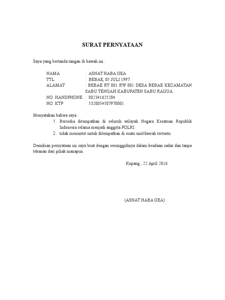 Surat pernyataan kerja penempatan dimana saja. Savesave surat pernyataan bersedia ditempatkan dimana saja for later. Surat pernyataan bersedia untuk ditempatkan di seluruh wilayah nkri dan semua tugas/fungsi kepolisian saya yang bertanda tangan di bawah ini : Demikian pernyataan ini saya buat dengan sesungguhnya tanpa tekanan dari pihak manapun. Surat pernyataan diperlukan untuk keadaan tertentu seperti melamar pekerjaan.