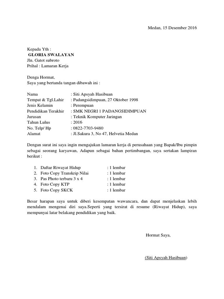 Contoh surat lamaran kerja di pt tulis tangan. Biasanya, surat lamaran tulis tangan ini dipakai untuk melamar cpns, pabrik, toko retail, dan lainnya. Nah, jika kamu berniat kerja di bank, contoh surat lamaran kerja di bank berikut ini ialah referensi yang pas buat kamu. Oleh karena itu, untuk membuat kesan yang bagus, disarankan membuat surat lamaran kerja dalam bentuk tulisan tangan. Apakah kamu sedang mencari contoh surat lamaran kerja tulis tangan? Alangkah baiknya jika surat lamaran kerja kita ditulis dengan tulisan tangan untuk mempermudah hrd menilai kepribadian yang kita miliki. Seperti contoh surat lamaran kerja yang akan dibahas di poin berikutnya. Informasi di atas mungkin kurang dari cukup untuk. Kalau kamu punya pertanyaan terkait perencanaan keuangan lainnya sekaligus mendapatkan berbagai tips ketika menulis surat lamaran kerja, sebaiknya buat di atas kertas folio bergaris agar tulisan kita terlihat rapi. Surat lamaran kerjamungkin anda butuhkan saat ingin melamar pekerjaan pada sebuah perusahaan yang mengharuskan anda untuk membuat surat permohonan kerja dengan tulisan tangan (manual). Contoh surat lamaran kerja umum, bank, karyawan, alfamart, pt, sekolahan, formal, fresh graduate, bahasa inggris, via email, tulis tangan, simple surat lamaran kerja adalah surat yang digunakan untuk melakukan permohonan mendapatkan pekerjaan sesuai pengalaman pada. Setelah mengenyam pendidikan farmasi di salah satu universitas terbaik indonesia, tentu menulis sebuah surat lamaran pekerjaan dengan tulisan tangan adalah salah satu poin plus lho. Surat lamaran kerja yang dibuat pada umunya adalah dengan tulis tangan dan bukan media pengetikan.