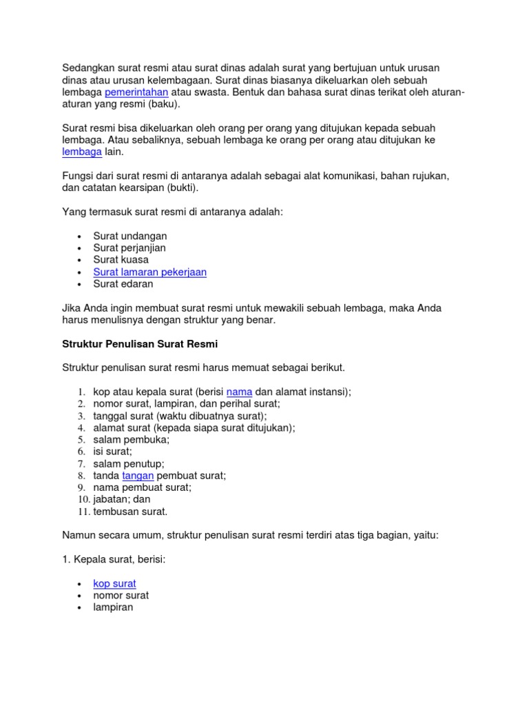 1 from Secara sederhana surat dinas adalah surat resmi yang dibuat oleh sebuah instansi pemerintah atau swasta untuk keperluan kedinasan. Surat dinas adalah sebuah surat yang dibuat dengan bahasa formal dari suatu instansi baik pemerintah maupun swasta, dimana surat tersebut memiliki tujuan kedinasan antar instansi. Adapun definisi surat dinas adalah sebuah surat yang dibuat dengan bahasa formal dari suatu instansi baik pemerintah maupun swasta, di mana surat tersebut memiliki tujuan kedinasan antar instansi atau lembaga. Penulisan alamat surat kepada pejabat pemerintah (surat dinas). Alamat yang dituju ditulis di sebelah kiri surat pada jarak tengah antara surat dan salam pembuka. Contoh umum yang masih salah adalah ketidaktahuan kode klasifikasi surat dan cara penulisannya. Selain instansi, surat dinas juga sering dibuat oleh kelompok yang tergabung dalam sebuah organisasi misalnya organisasi di lingkungan kampus ataupun sekolahan. Dalam penulisan surat dinas, tidak semerta merta asal menulis saja, melainkan terdapat berbagai point tanggal surat menerangkan nama tempat dan kapan surat dinas tersebut dibuat.
