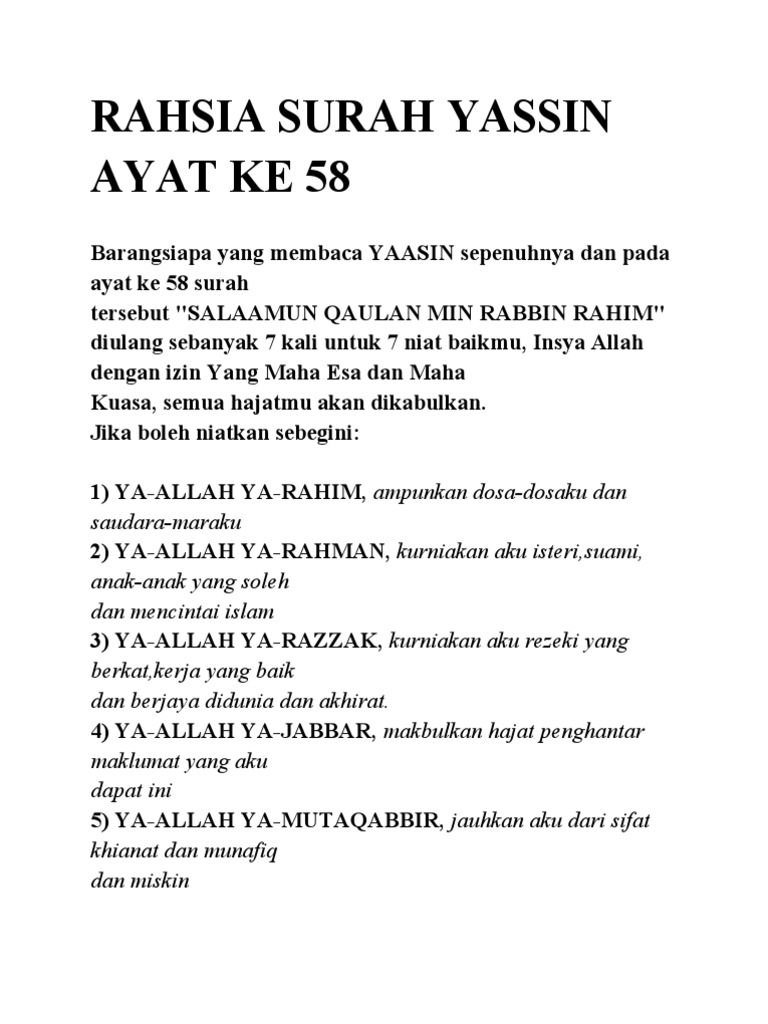 Kelebihan Amalan Rahsia Surah Yassin Ayat 58 Majalah Ilmu from majalahilmu.com Masjid al aqsha delatinos bsd sepanjang ramadhan 1442 hijriah membagikan sebanyak 3.438 bingkisan senilai total rp515.700.000. Kelebihan surah yasin ayat 58 barang siapa yang membaca surah yasin ayat ke 58 sepenuhnya dengan penuh keikhlasan dan keyakinan iaitu dalam bahasa rumi, salaamun qaulan min rabbin rahim , diulang sebanyak 7 kali untuk 7 niat yang baik, insya allah dengan izin allah yang maha berkuasa, semua niat dan hajat kita itu akan dikabulkan. Fadhilah surat yasin ayat 58. سَلٰمٌۗ قَوْلًا مِّنْ رَّبٍّ رَّحِيْمٍ (kepada mereka dikatakan), salam, sebagai ucapan selamat dari tuhan yang maha penyayang. In the name of allah, the beneficent, the merciful peace: Untuk baca seluruh surat, klik link berikut: Apabila bisa niatkan sebegini : Salam inilah yang sangat mereka harapkan karena merupakan suatu bentuk pemuliaan bagi mereka.